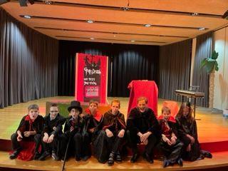 Der Abend begann mit einem Schockmoment, der den Schülern und selbst den Lehrpersonen kurz den Atem stocken ließ: Pünktlich zur Begrüßung stieg doch tatsächlich ein waschechter Vampir aus einem Sarg, der eigens für diesen Anlass in der Aula aufgestellt worden war! Mit dieser schaurig-schönen Eröffnung war die Atmosphäre für die Nacht des Grauens – natürlich mit einem Augenzwinkern – perfekt gesetzt.
