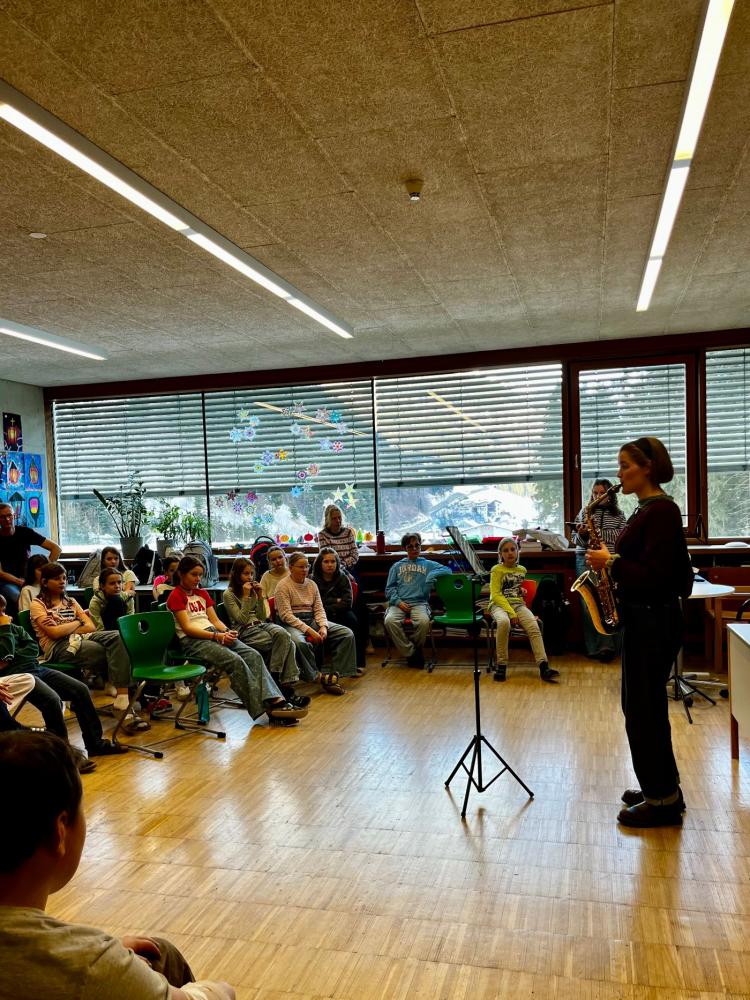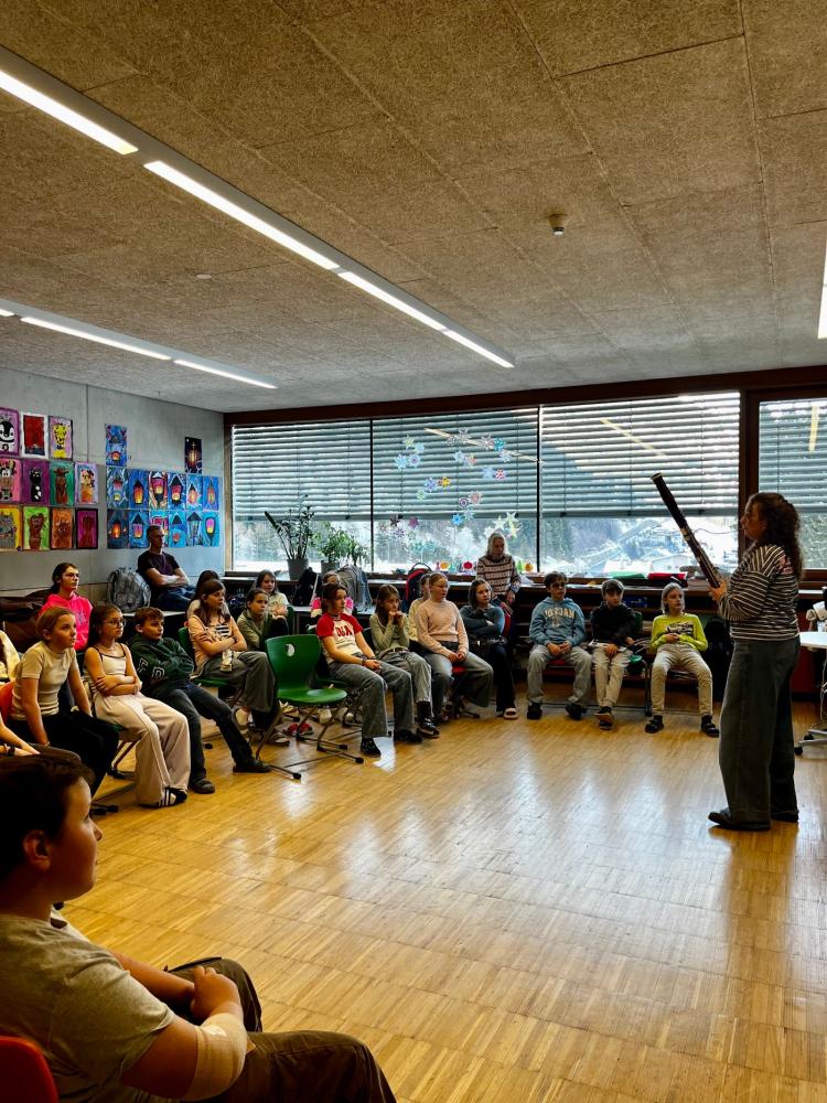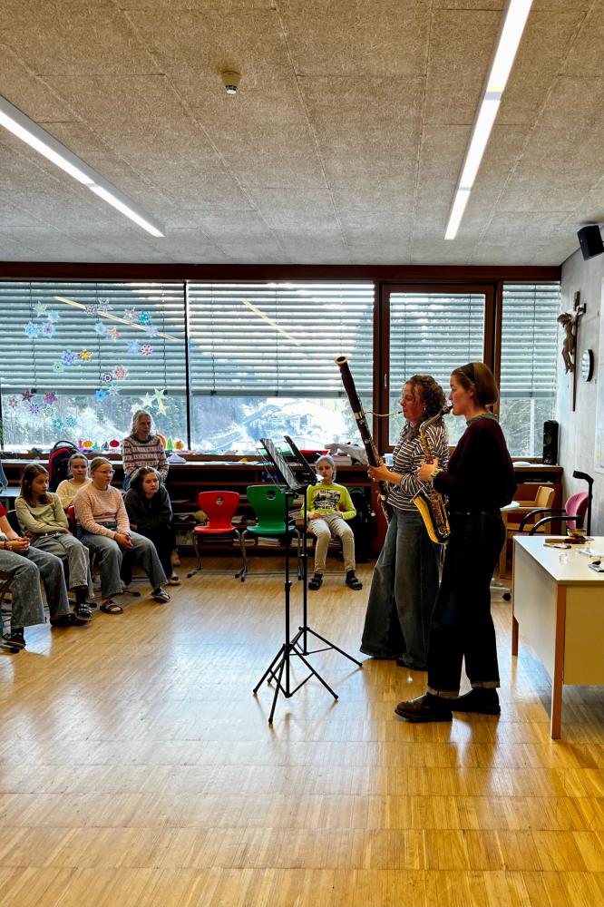 Magdalena Kurz (Fagott) und Emma Nigg (Saxophon), die in Wien studieren, gaben spannende Einblicke in das Leben als Musikerinnen. Besonders beeindruckend war ihr Können an den Instrumenten: mit ganz speziellen Klängen und wunderschönen Melodien begeisterten sie die Schülerinnen und Schüler.