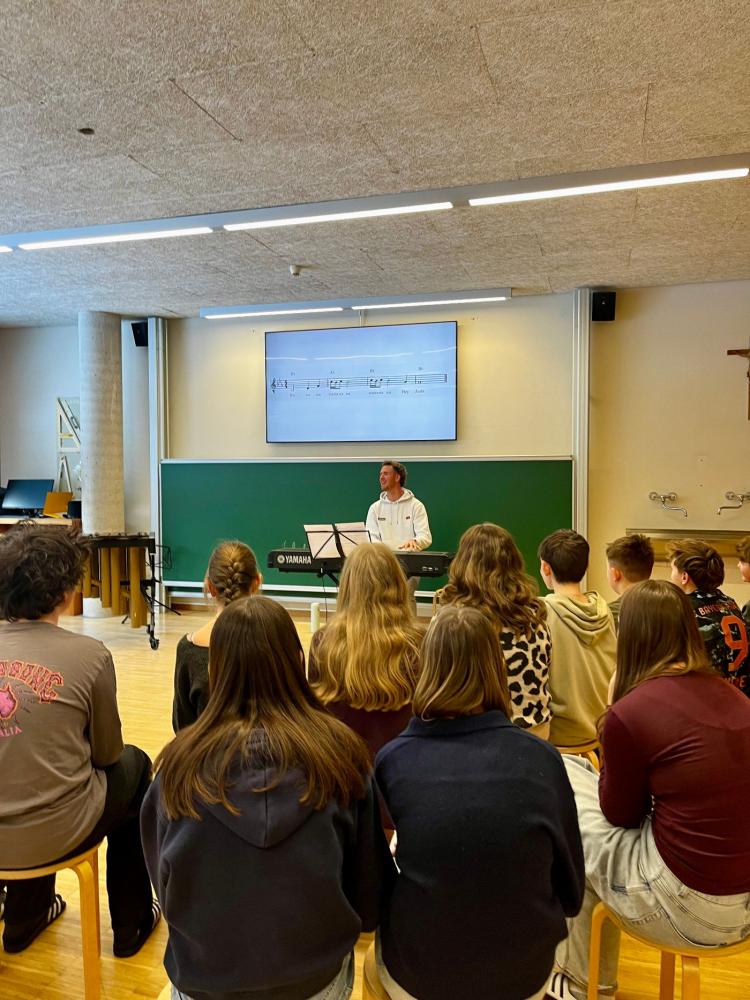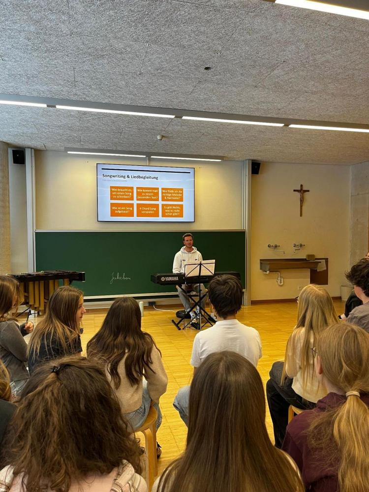 Johannes Wechner stellte den Schülerinnen und Schülern sein Studium am Mozarteum Salzburg sowie seine Ausbildung zum Musiklehrer vor. Dabei durften die Kinder selbst aktiv werden, ihre eigene Stimme ausprobieren und selbstgeschriebene Songs hören.